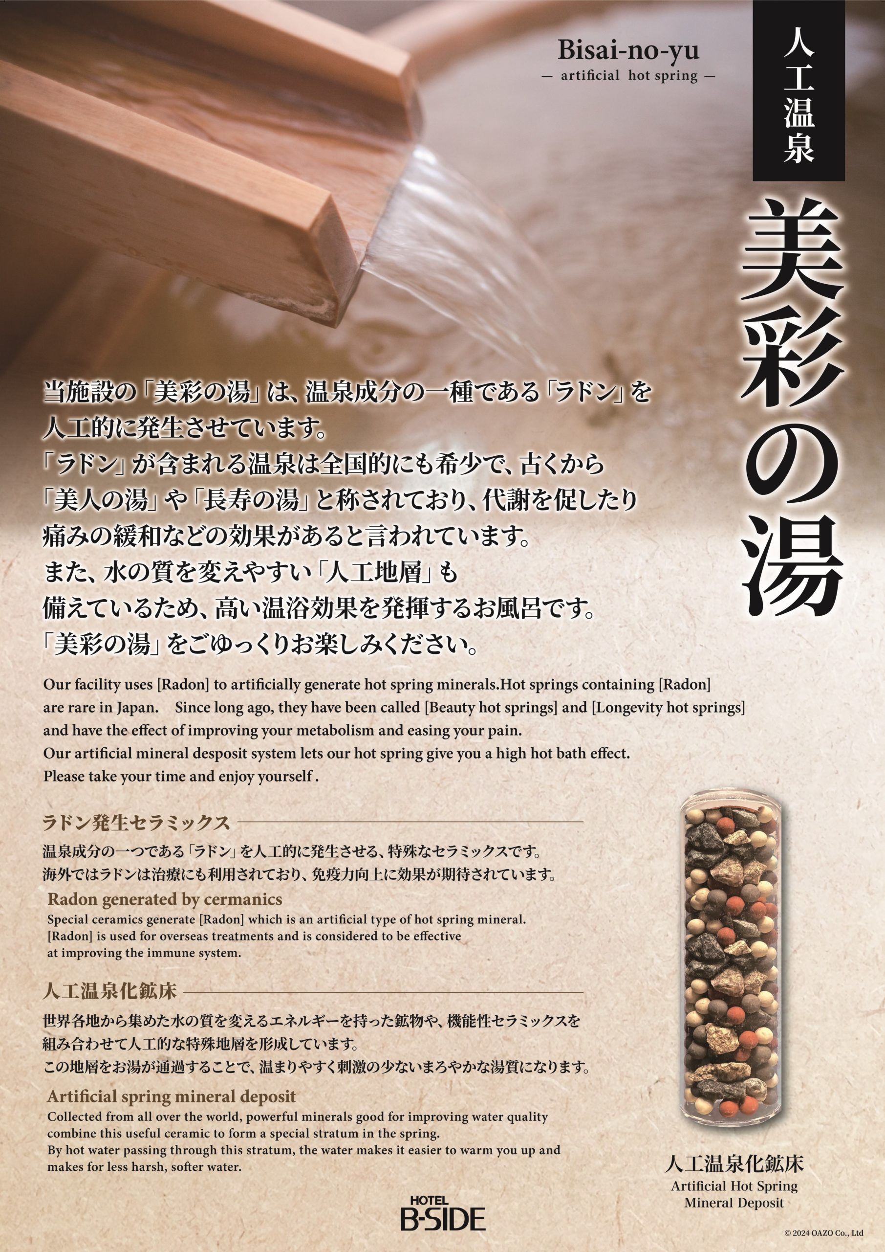 オーナー様がお持ちの宿泊施設に以前人工温泉システムを導入していただき、好評をいただいていたことから、 こちらの施設にもご導入をしていただく運びとなりました。 ご導入にあたっては、施設のスタッフ様にも丁寧にご対応をいただき、導入までをスピーディーに実施できました。 ありがとうございました。